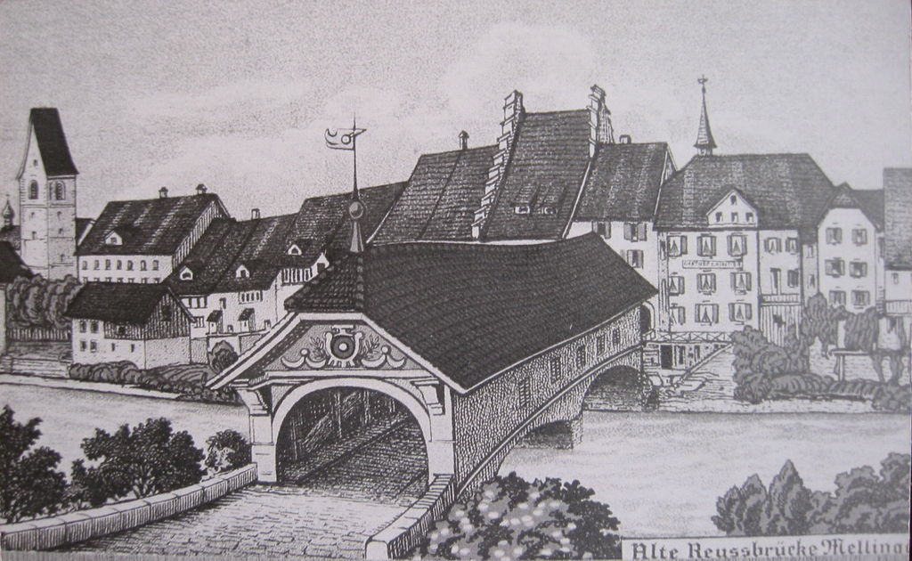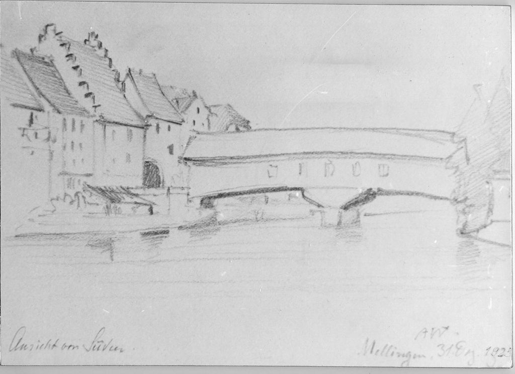 Zeichnung von unbekannter Hand. Da die Zeichnung mit "Alte Reussbrücke Mellingen" beschriftet ist, darf angenommen werden, das Werk sei nach dem Abbruch der Brücke, der 1927 erfolgte, angefertigt worden.