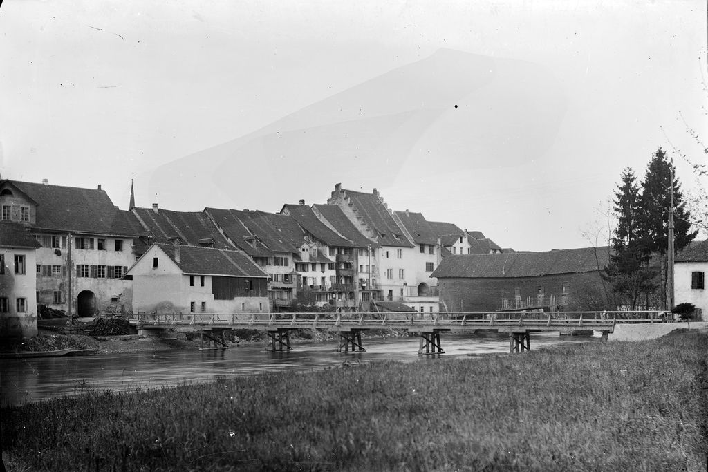 "Die Notbrücke in Mellingen, errichtet 1926. Sie diente als Ersatz für die ... 1927 abgerissene Holzbrücke, die leider einer 'stabilen Stahlbrücke' weichen musste. Der Durchgangsverkehr wurde damals vom alten Schützenhaus über diesen einfachen Holzsteg durch den heute noch bestehenden Reussdurchgang beim Rathaus, die Kleine Kirchgasse und das schmale historische Tor beim Zeitturm geleitet. Ob dieses Provisorium, das gleich nach der Inbetriebnahme der neuen Brücke wieder entfernt wurde, dem Hochwasser auch standhält, begutachteten nebst einigen anderen 'Zaungästen' auch Metzgermeister [Adolf] Buchmüller (mit der weissen Schürze) ...".