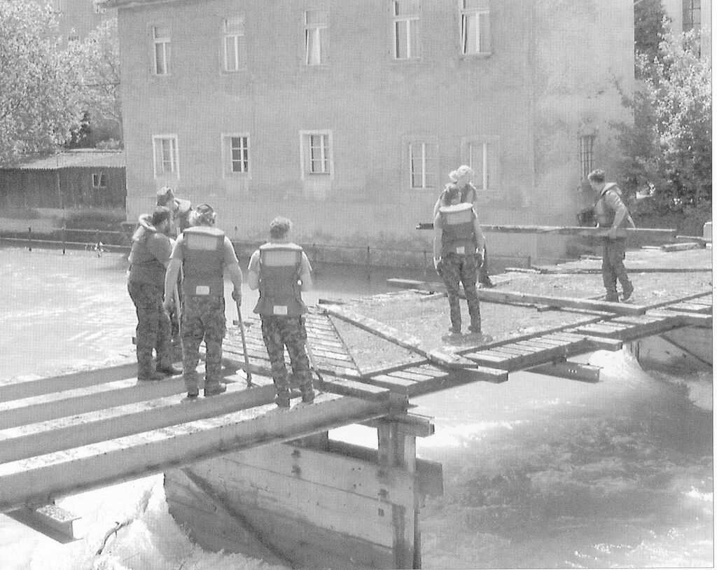 Vor nur wenigen Tagen hat man noch darum gezittert, dass die alte Soldatenbrücke den Fluten des Hochwassers standhalten möge; jetzt hat ihr letztes Stündlein geschlagen. Ca. 30 Soldaten der Sap KP I/45 haben sich auftrags- und abmachungsgemäss daran gemacht, vorerst das Geländer und den Gehweg abzubrechen. Die Joche müssen noch warten, bis sich der Pegelstand hinreichend normalisiert hat.