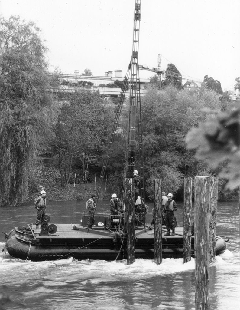 Obwohl der Brückenbau für die 45er etwas Alltägliches ist, stellt der Mellinger Reussübergang aussergewöhnliche Anforderungen. Der Zivilbau verlangt eine hundertprozentige Qualität. Die sehr engen Platzverhältnisse und der schwierige lehmige Untergrund im Flussbett bilden zusätzliche Erschwernisse.