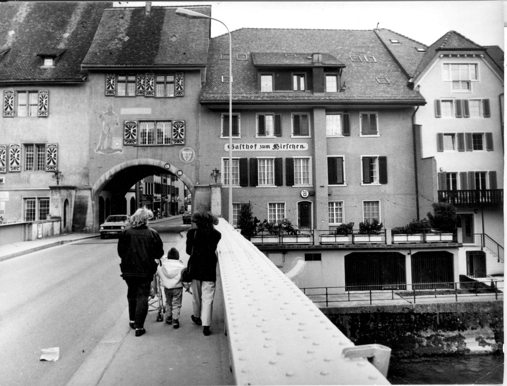 Zur Datierung: 1987 wurden auf den Postamenten vor dem Brückentor schmiedeeiserne Laternen montiert. 1989 wurde der Gasthof Hirschen geschlossen.