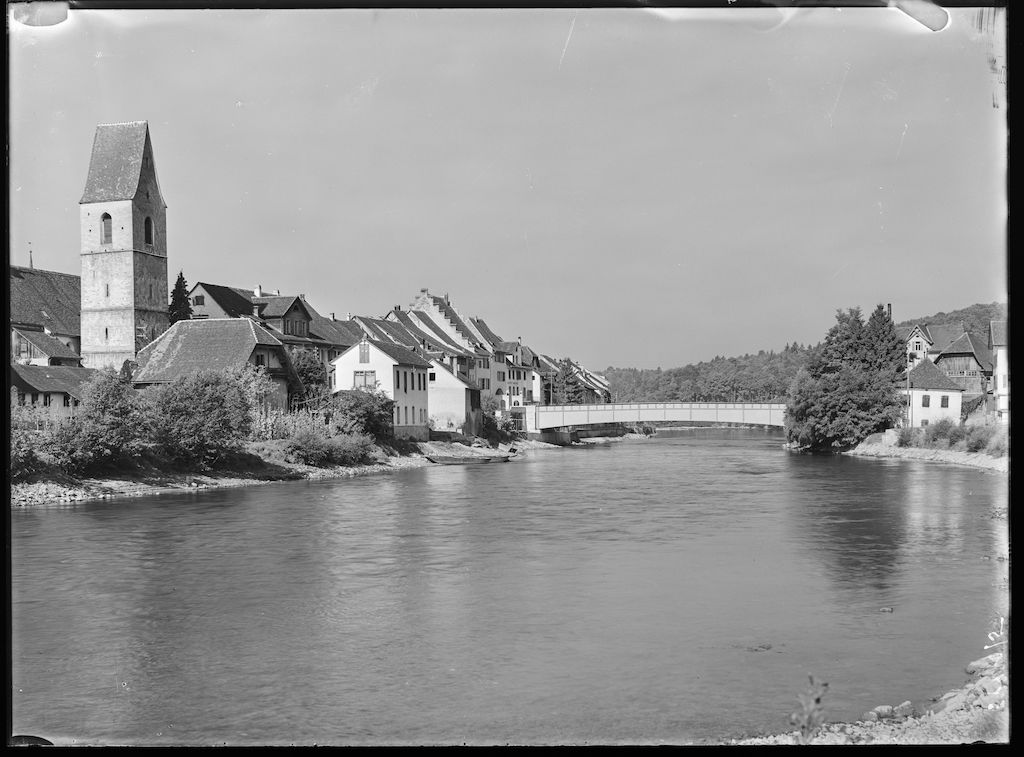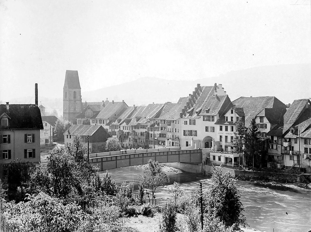 ca. 1930 Blick auf die neue Brücke und nordöstliche Reussfront der Altstadt.