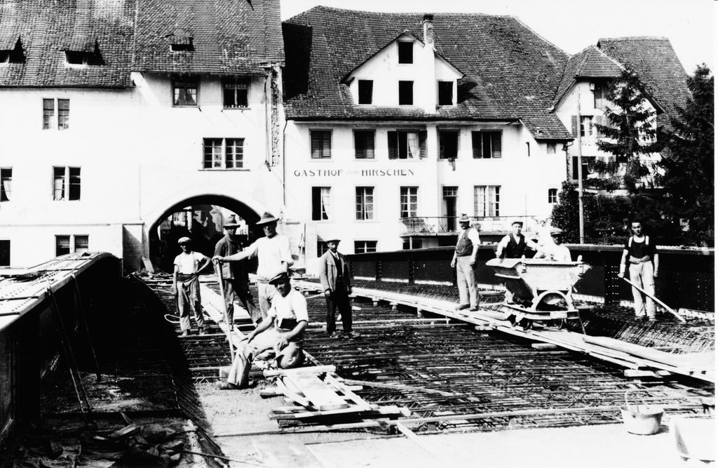 Einbau der Fahrbahn aus Beton auf der neuen Brücke. Mit diesem wurde am 20. April 1928 begonnen. Die Armierungseisen sind verlegt.