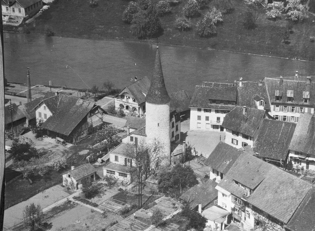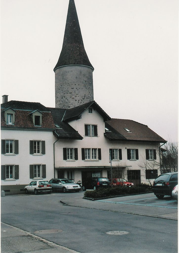 Rechts der nordwestlichste Teil der Altstadt. Links des Turms der Bauernhof Roth. Am Turm angebaut die Firma Läuchli.