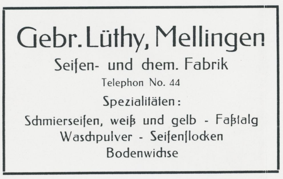 Gründer der Seifensiederei Lüthy war der in Holziken geborene Adolf Lüthy (1870-1947). Bald nach 1890 wanderte er nach Amerika aus. Nach seiner Rückkehr arbeitete er in gehobener Stellung in der neu gegründeten Seifenfabrik Sunlight. Kurz vor dem Ersten Weltkrieg siedelte er nach Mellingen um. Er erwarb das Restaurant "Stadttor". Dieses übergab er dann seinem Schwiegersohn Heinrich Meier. 1915 gründete er die Seifensiederei. Mit von der Partie waren anfänglich seine Brüder Eugen und Kurt. Später ging die Firma an seinen Sohn Adolf Lüthy (1894-1970) über, der die Liegenschaft 1959 verkaufte.