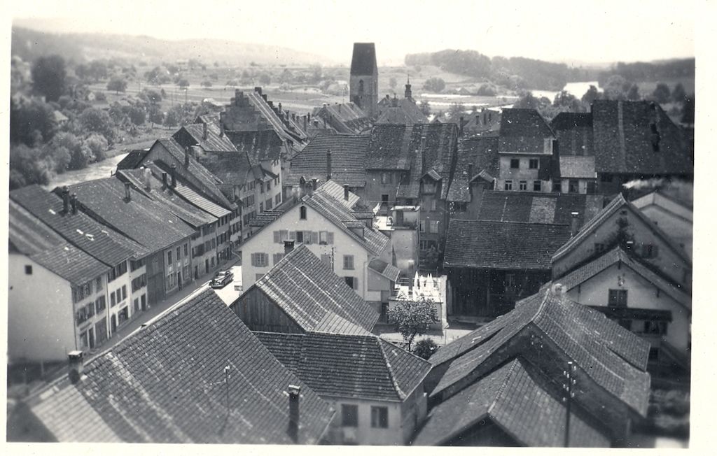 Blick auf die Häuser zwischen Bruggerstrasse und die Scheunengasse sowie im Hintergrund auf die nordwestlich gerichtete Häuserzeile der Hauptgasse. Beachtlich der mächtige Dachstock des Hotels "Löwen", der 1967 noch durch das links davon liegende Haus erweitert wurde.