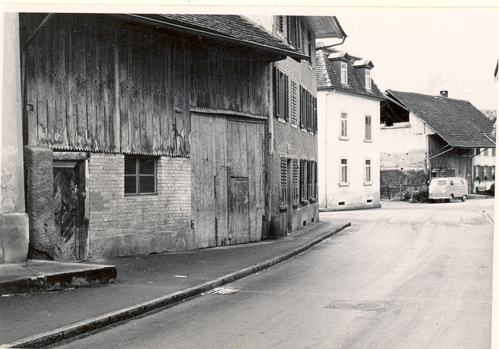 Elisabeth Van Heijningen-Riegger, die in ihrer Jugend gleich gegenüber wohnte, mag sich noch gut an die Zeit erinnern, als die Scheune noch stand: „Der Durchgang am linken Bildrand zwischen den beiden Liegenschaften Haus Bruggerstrasse 9 und Scheune war ca. 80 cm breit und diente uns bei den Versteckspielen. Alle Hunde im Unterstädtli benutzten ihn auch [als Versäuberungsplatz] und man musste gut aufpassen, wo man den Fuss platzierte!“