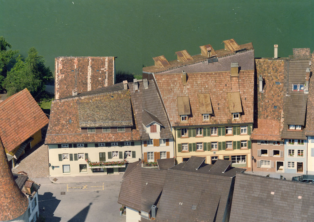 Im Hintergrund das sogenannte „Kaufmannhaus“ (Bruggerstrasse Nr. 11) im Bereich des Hexenturms.