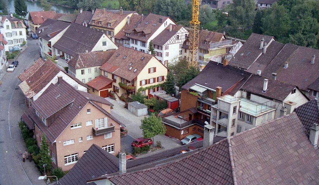 Blick auf den untern Teil der Bruggerstrasse. Links die Scheunengasse. Ganz rechts weist der gelbe Kran darauf hin, dass das Foto 1988 aufgenommen wurde. Damals wurde das Haus Bruggerstrasse 20 (auf vorliegendem Bild nicht sichtbar) umgebaut.