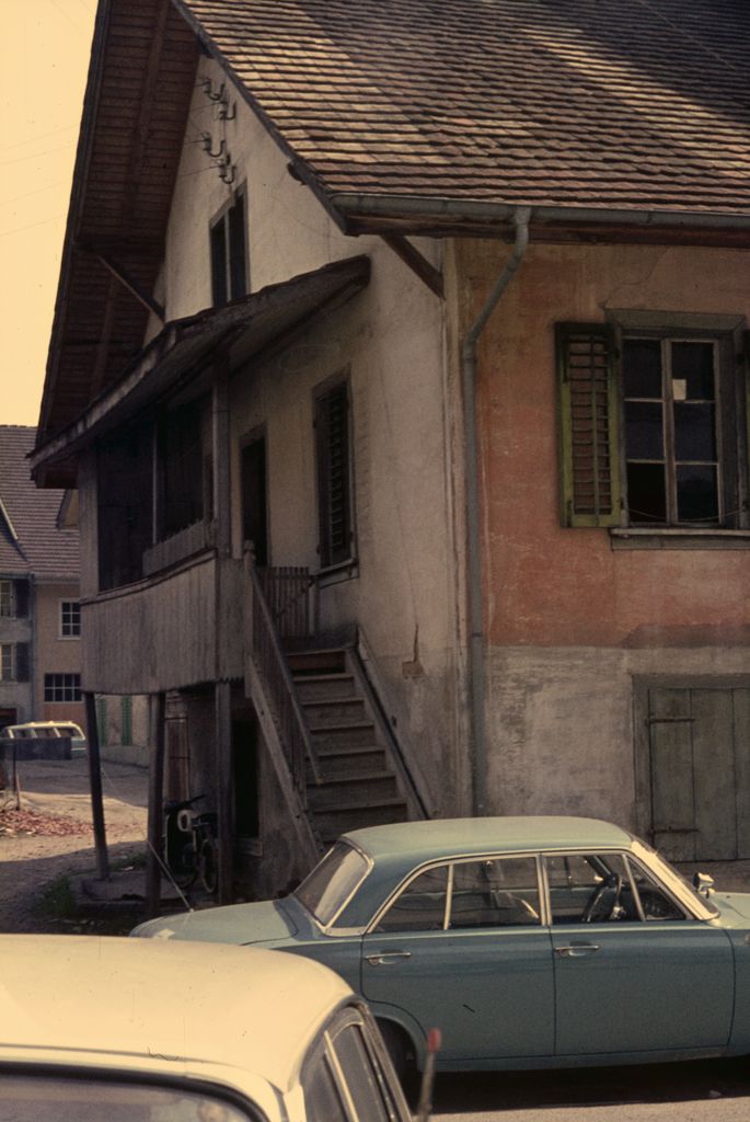 Dieses Gebäude wurde 1969 abgerissen. An dessen Stelle wurde von Spengler-Sanitär Alfred Krattiger ein Wohn- und Geschäftshaus, Scheunengasse Nr. 2, gebaut. Die Profilstangen stehen schon. Auch das sürdlich gelegene Haus von Wagner Michel musste dem Neubau Krattiger weichen.