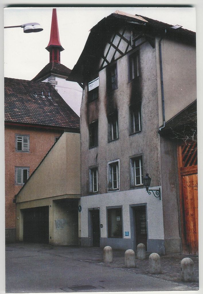 Brand am 5. Mai 2004. Nach dem Brand wurde das Haus vorbildlich restauriert. Das angrenzende Ortsmuseum erlitt keinen nennenswerten Schaden. Jedoch mussten alle Vitrinen und Exponate vom Russ gereinigt werden.