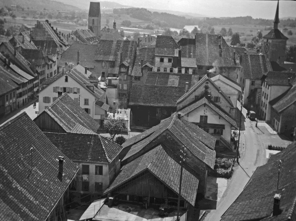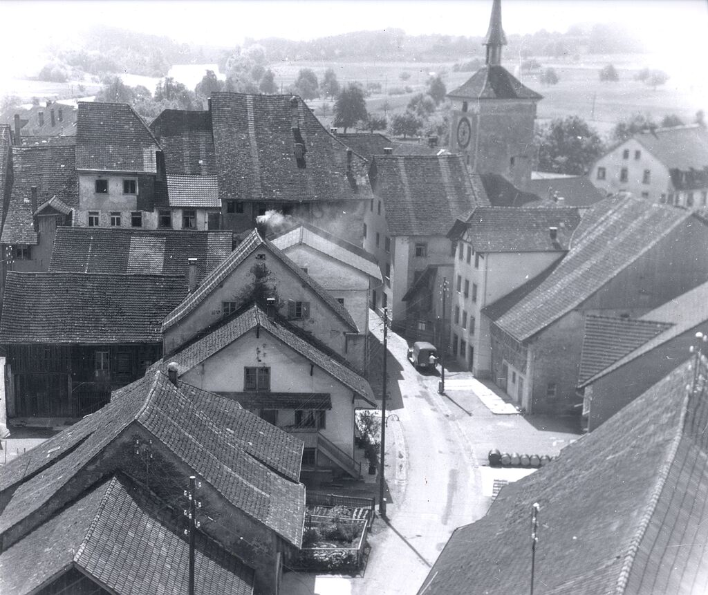 Rechts vorne steht die Seifensiederei Lüthy mit den Fässern und die Stadtscheune (das heutige Ortsmuseum). Und alles überblickend das Dach und das hohe spitze Türmchen des Zeitturms.