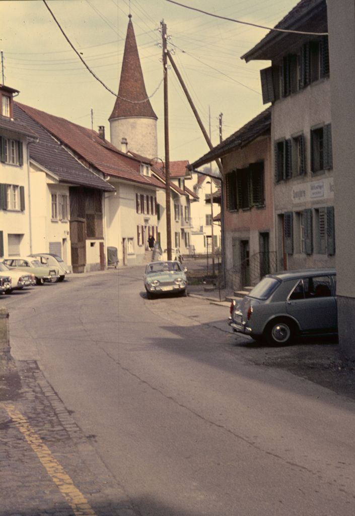 Blick in die Scheunengasse, rechts die Lenzburgerstrasse. Parallel zur Bremgartenstrasse stehen die ersten um 1950 erbauten Einfamilienhäuser am Rigiweg. Der Zeitturm ist noch nicht restauriert.