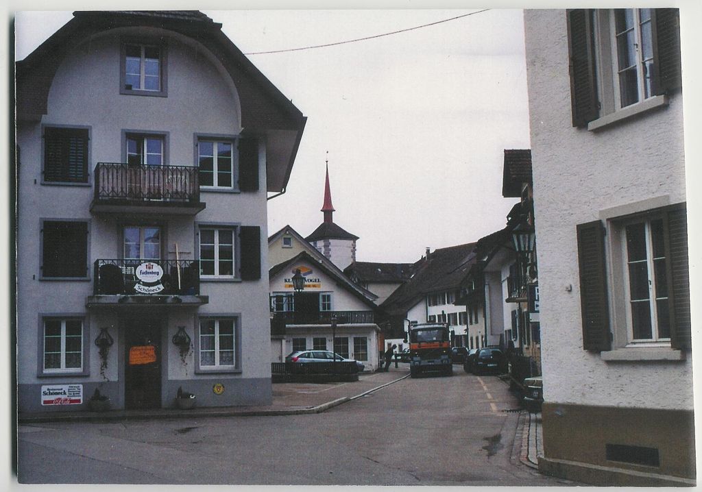 Mehr1967 wurde beispielsweise der neue Löwensaal (s. Bild-Nr. 05055) in Betrieb genommen. Gleich unterhalb der Gaststätte bezog die Familie Krattiger eine neue Spenglerei mit Büro und Wohnräumen (s. Bild-Nr. 05058.0). Auf der Gegenseite der Gasse brach man zwischen der Stadtscheune, dem heutigen Ortsmuseum, und dem Haus Nr. 10 drei Gewerbe- und Wohneinheiten ab, darunter die einstige Seifenfabrik Lüthy (s. Bild-Nr. 05051.2) und errichtete auf diesem Areal neuzeitliche Wohnungen ( Scheunengasse 9a und b, s. Bild-Nr. 05061.20).