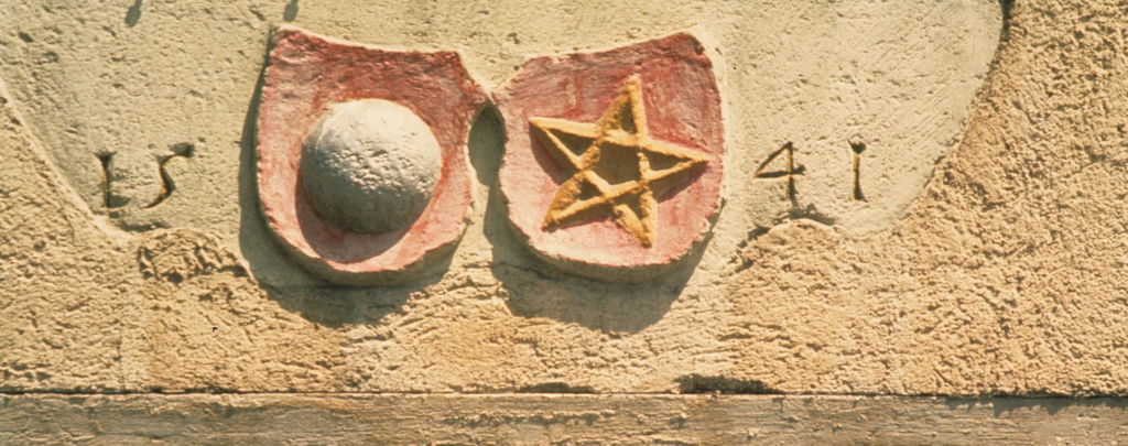 Zwischen Erdgeschoss und erstem Obergeschoss ist das Mellinger Kugelwappen und ein Drudenstern, flankiert von der Jahreszahl 1541, angebracht. Der Drudenstern – im Gegensatz zum sechsstrahligen Davidstern - ist fünfzackig und geometrisch gesehen ein Pentagramm. Dieses Zeichen hat eine vielfältige Bedeutung. Ist es an einem Gebäude angebracht, gilt es als Schutzsymbol, was für dieses öffentliche Gebäude auch zutreffend sein dürfte: Denn in diesem Haus fanden die fremden Wandergesellen gratis Unterkunft. Bekanntlich mussten Handwerker früher nach der Lehre bei ihrem Meister einige Jahre in die Fremde, d.h. auf die Walz gehen, um sich bei auswärtigen Meistern weiterzubilden. Erst nach dieser Wanderzeit durften sie sich Meister nennen.