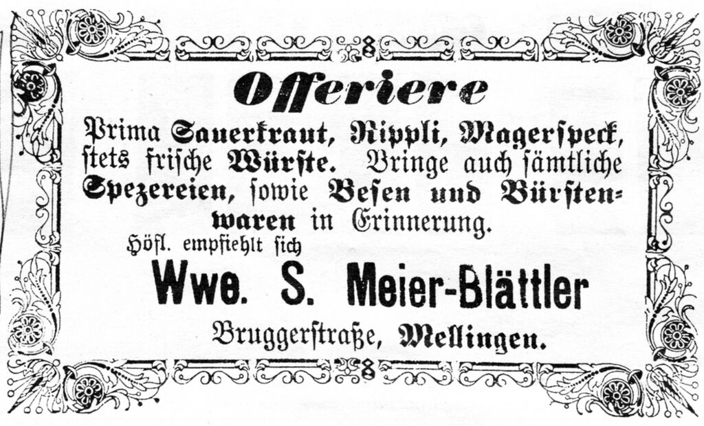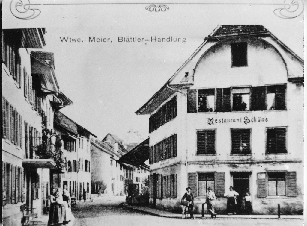 Die Bezeichnung „Wtwe Meier, Blättler-Handlung“ gehört zum Gebäude links Bruggerstrasse Nr. 42. Dieses Gebäude hatte damals zwei Eingänge.