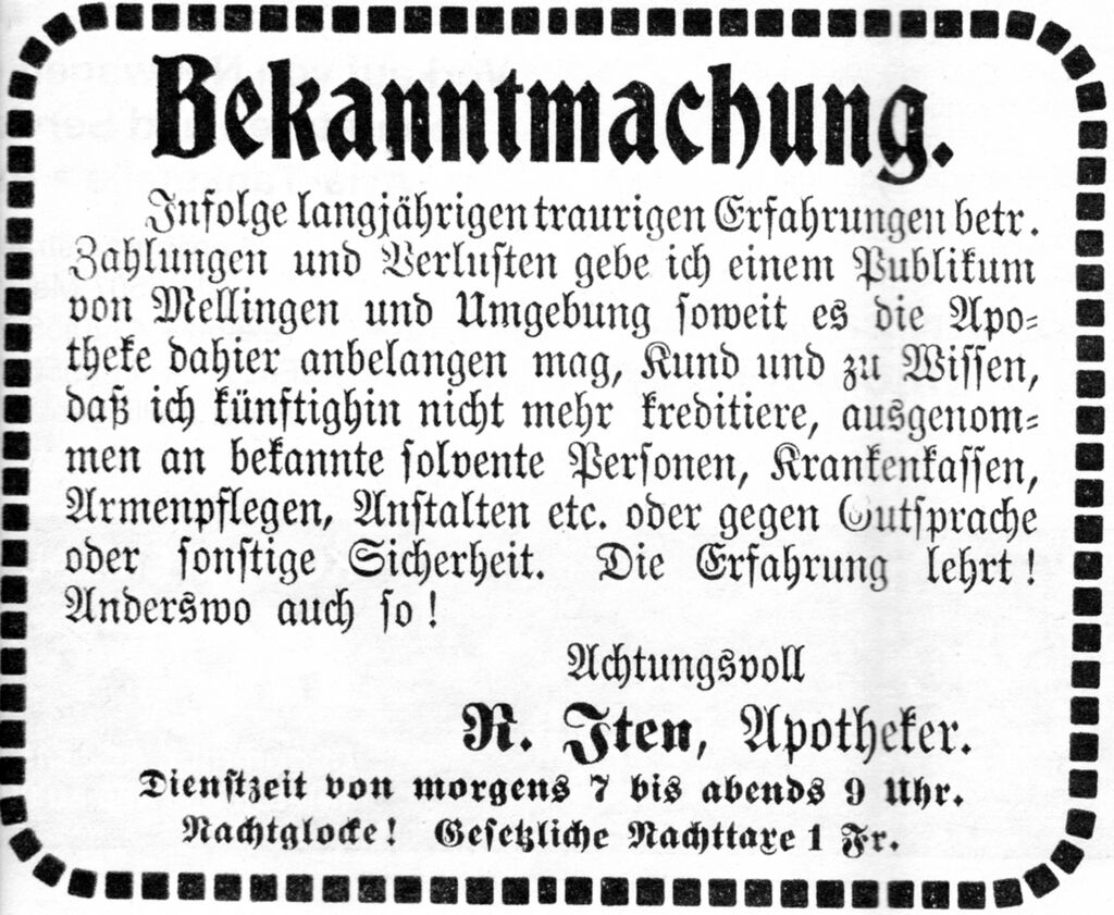 August 1898: Verkauf an Apotheker Josef Robert Iten-Iten von Mellingen. Über sein Studium und die frühere Tätigkeit als Apotheker: s. Bild-Nr. 04001.7.