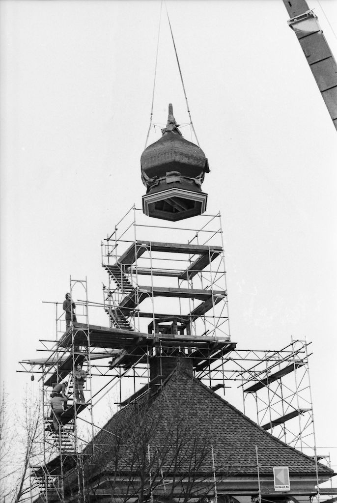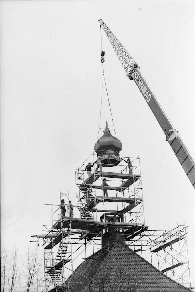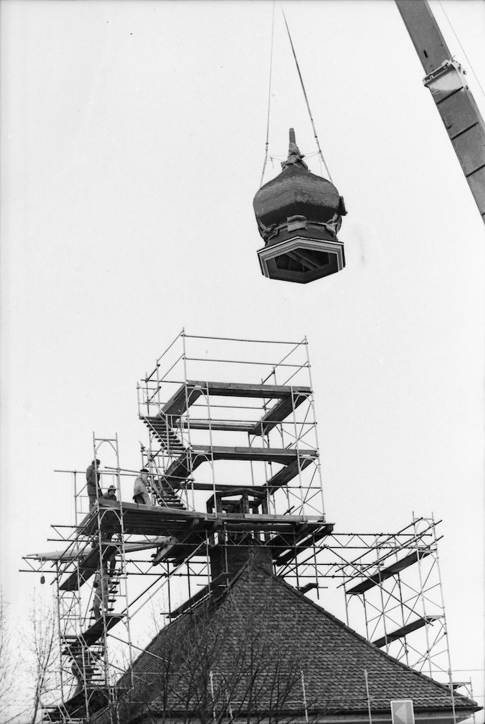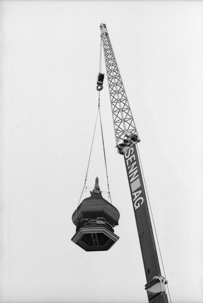 Das neue Zwiebeldach wird mit dem Pneukran auf den Dachreiter gehievt.