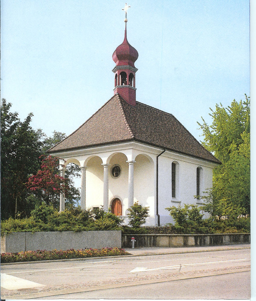 1736 wird die heutige Kapelle von Baumeister Georg Abt aus Bünzen gebaut. Bereits am 16. Oktober segnete der Probst von Luzern, Johann Kaspar Mayr von Baldegg die neuerstandene Kapelle gleichzeitig mit dem angelegten Friedhof ein. Der Platz für den Gottesacker wurde mit dem Bau der heutigen kath. Pfarrkirche (1675) zu eng. Das eigentliche Kernstück des Interieurs bildet das Tabernakel mit dem Heiligen Antonius, ein Werk des Mellinger Künstlers Caspar Joseph Widerkehr. Die qualitätsvolle Schöpfung zeigt den verzückten Heiligen, der devot vor einem schemelförmigen Tabernakel kniet und mit beiden Armen das Jesuskind umschliesst. 1865 Bei der Renovation liess der streitbare Pfarrer Jakob Leonz Sachs die Antoniusfigur mit dem Jesuskind entfernen. Der entzückt dreinblickende Antonius schien dem Pfarrer nicht zu behagen, und der aus der Bauzeit stammende Altar wirke zu „kolossal“ für den kleinen Kirchenraum. Bis zur nächsten Kapellenrenovation im Jahre 1923 unter Pfarrer Richard Bopp fristete die Antoniusfigur ein wenig beachtetes Dasein im Iberg, dem damaligen Altersheim. 1923 Bei den umfassenden Restaurationsarbeiten kehrte die Antoniusfigur auf einen neuen Altar zurück, geschaffen von den Einsidlern Künstlern Alois Payer und Franz Wipplinger, zusammen mit Hochreliefs an den Chorwänden mit Gottvater in der Engelglorie und Szenen aus dem Leben des Heiligen Antonius. 1981 – 83 Bei den umfassenden Restaurierungmassnahmen trachtete man mit dem Konzept dahin, den baulichen Zustand nach der Bauzeit von 1736 wieder zu erreichen.
