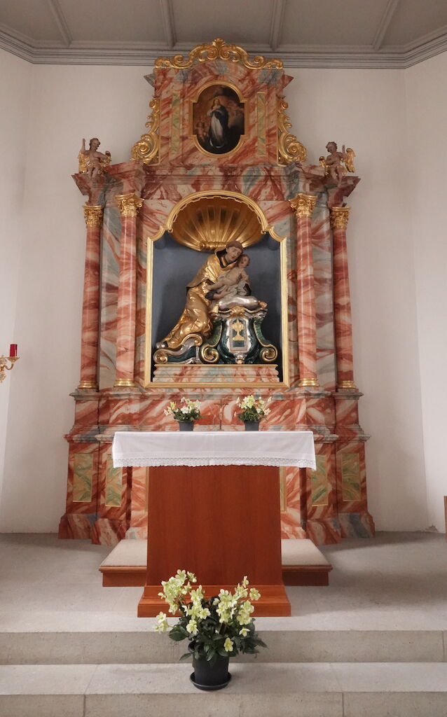 MehrDie im Zuge der Kapellenerneuerung restaurierte polychrome Vollplastik ist das Hauptwerk des Mellinger Bildhauers Caspar Joseph Widerkehr (1709-1769) "und offenbart etwas von der charakeristisch barocken Idee des die Funktionen übergreifenden Gesamtkunstwerks." Die Figur schuf Widerkehr 1739.