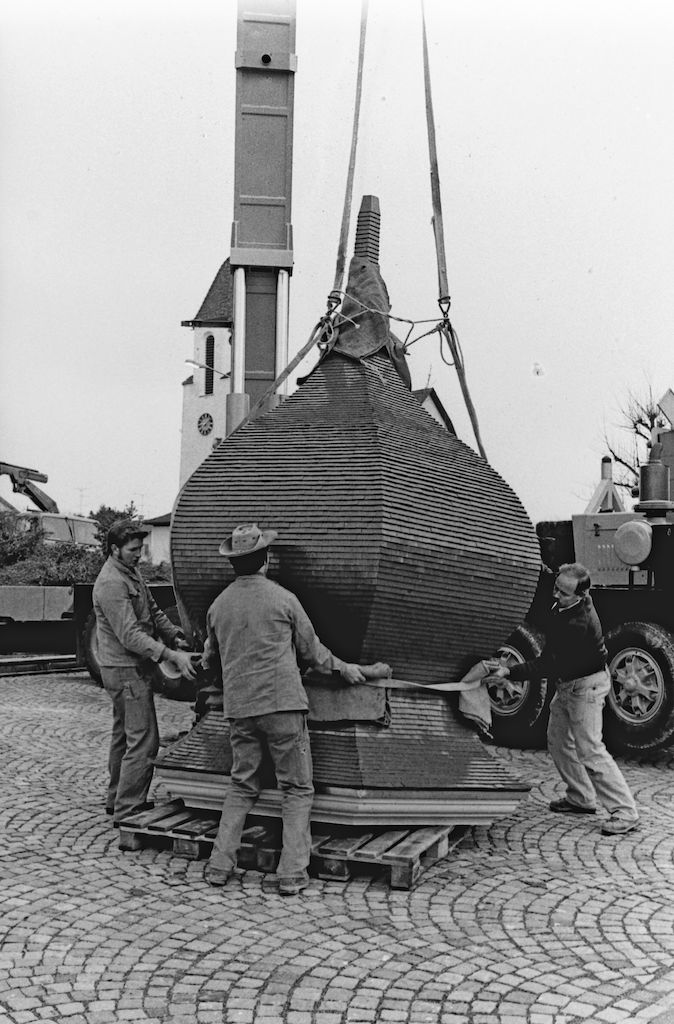 Noch steht das Zwiebeldach auf dem Vorplatz der Kapelle, um darauf mit dem Pneukran auf den Dachreiter gehievt zu werden.