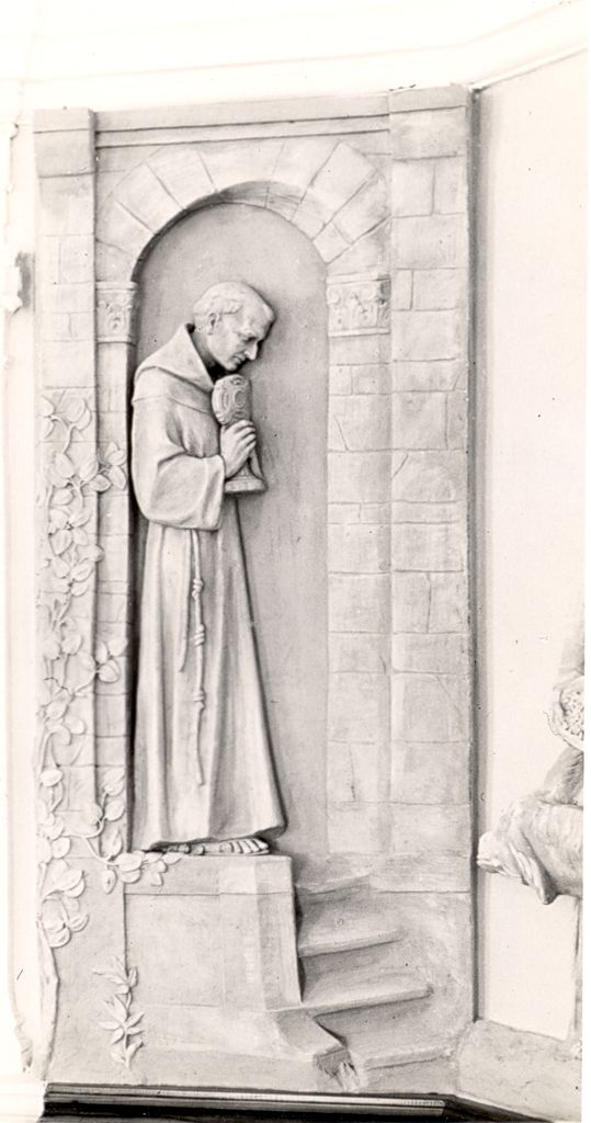 Die Antoniusfigur von Caspar Joseph Widerkehr - jetzt in Weiss gefasst - auf dem von Alois Payer und Franz Wipplinger gestalteten Altar. Noch fehlen die Plastiken über der Antoniusfigur und die Reliefs links und rechts des Altars, ebenfalls Werke von Payer und Wipplinger.