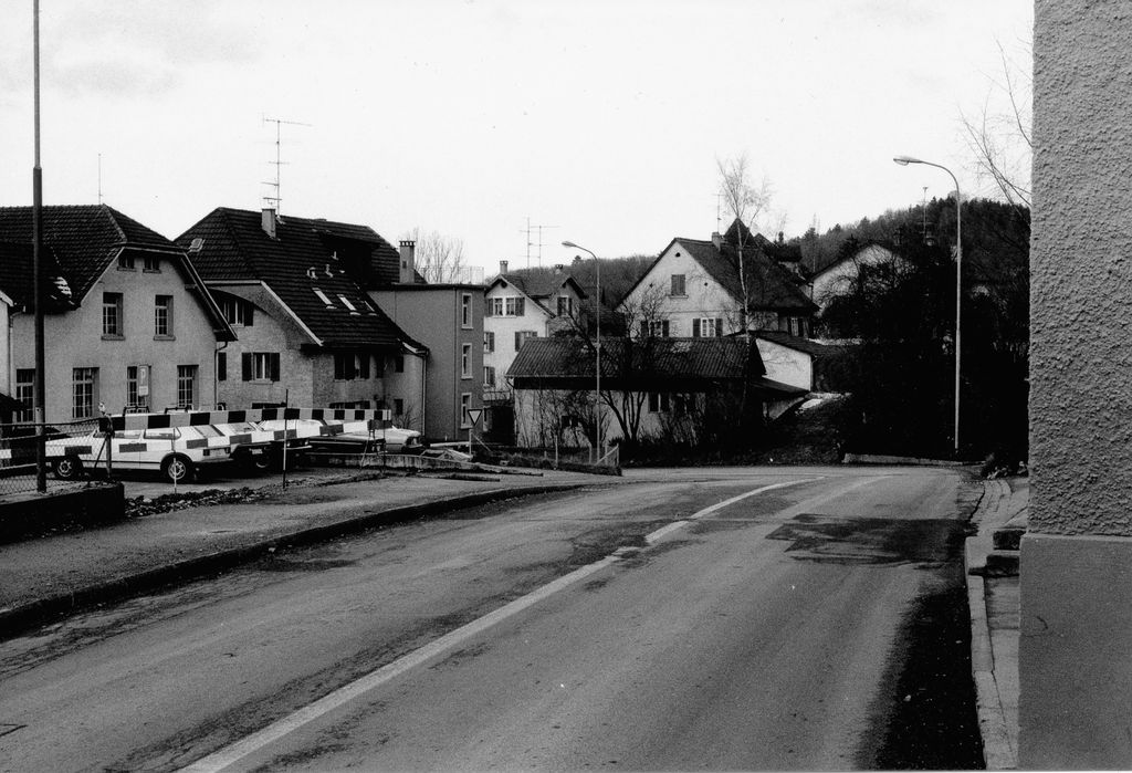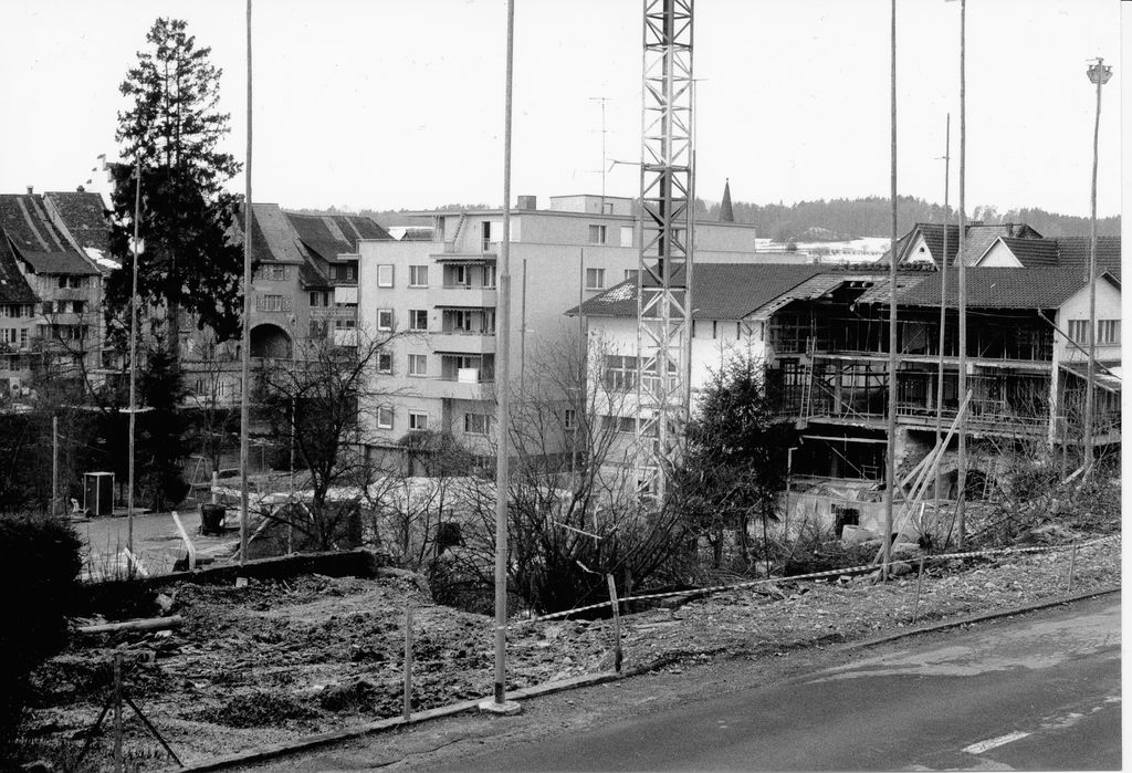 Blick auf das ehemalige Fabrikgebäude der Firma Klüber, vermutlich 1981. Das Gebäude wurde zum 1983 eröffneten Coop-Center (Zentralplatz 2a) umgebaut. Im Vordergrund die Profilstangen für das Mehrfamilienhaus Stetterstrasse 6. Links der Fabrikgebäude das 1966 bezogene Mehrfamilienhaus Zentralplatz 2.