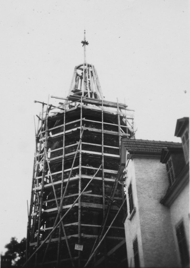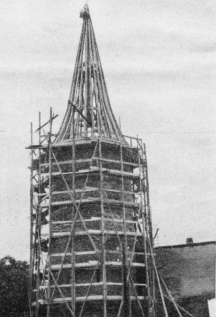 Erneuerung des Mauerwerks und Rekonstruktion des 1902 abgebrannten Spitzkegeldachs. Das Balkenwerk der Turmspitze fehlt noch, s. im weitern über den Dachstuhl Bild-Nr. 05505.