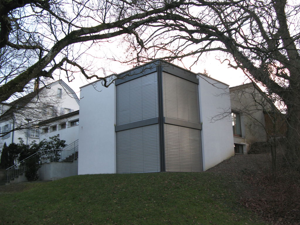 Das Kirchgemeindehaus wurde um zwei Mehrzweckräume erweitert und der bestehende Jugendraum im Untergeschoss wurde vergrössert und erhielt einen direkten Zugang von Aussen. Das neue würfelförmige Bauvolumen schliesst leicht abgesetzt vom bestehenden Gebäude und der bestehenden Zugangstreppe an das Kirchgemeindehaus an. Der Zwischenraum zwischen Zugangstreppe und Anbau dient dem direkten Zugang ins Untergeschoss. Der Anbau ist absichtlich sehr schlicht gehalten und als Anbau ablesbar gestaltet. Die grossflächige Eckverglasung lässt den Anbau leicht erscheinen und bietet von den beiden Mehrzweckräumen einen schönen Ausblick auf die umgebenden Bäume.