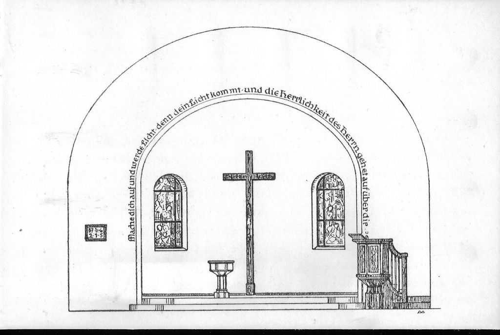Im Chorbogen erscheint an Stelle der Scraffitobilder ein Vers aus der Schrift des Propheten Jesaija, in der Chormitte ein markantes Kreuz und in den Chorfenstern (s. Bild-Nrn. 08107 und 08108) die Darstellung des Gleichnisses von den klugen und törichten Jungfrauen, bemerkenswerte Werke der Glasmalerin Minna Bühler, Utzenstorf.