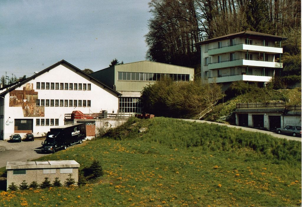 Das Firmengelände vor der grossen Umbau 1945. Links: Wohn- und Bürogebäude, rechts die alten Betriebsgebäude, die 1945 total neu gebaut wurden.
