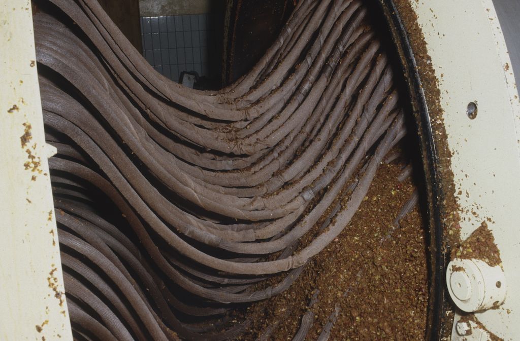 Es fällt dem Laien überhaupt sehr schwer, in den sauberen Räumen der Mosterei einigermassen Übersicht zu behalten, denn wenn einmal die Äpfel in den Silos verschwunden sind, bekommt man sie nur noch auf der Waschstrasse zu Gesicht. Nachher verschwinden die Früchte in der Obstmühle, die eine gewaltige Kapazität von 10 Tonnen in zehn Minuten erreicht. Die nun zur sogenannten Maische zerkleinerten Früchte gelangen für den Aussenstehenden unsichtbar durch Rohre in die automatische Presse. Dabei wird bereits etwa 65% des Saftes ausgepresst. Mit gewaltiger Kraft holt nun die hydraulische Presse den letzten Rest Flüssigkeit aus der Maische heraus, wobei sich der Druckkolben von Zeit zu Zeit etwas lockert, damit die Masse in der Presse in eine andere Lage gebracht werden kann. All dies geschieht natürlich vollautomatisch. Durch diesen Arbeitsgang ist nochmals eine ganze Menge Saft zu gewinnen. Während nun das köstliche Nass zur Weiterverarbeitung wegfliesst, gelangt der Trester über eine Trocknungsanlage und Förderbänder in Silos. Heute findet der Trester Verwendung bei der Pektingewinnung und als begehrtes Futtermittel, vor allem der Birnentrester. Die 'Meli' stellt jedoch auch eine ganze Reihe von Obstbranntwein her."