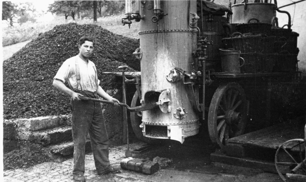 Auf dem Bild heizt Ernst Busslinger, 1942 neuer Inhaber der Mosterei mit Spezialitätenbrennerei und Stadtammann von Mellingen, den Kessel ein. Die Brennerei wurde 1990 eingestellt.
