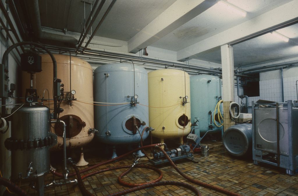 Blick in die Brennereiabteilung, ca. 1972 mit Martin Schmid
