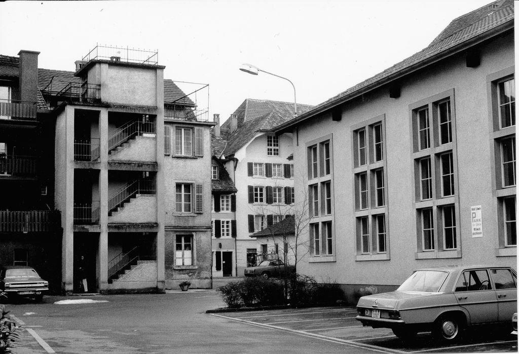 Links die Hinterseite der ehemaligen Bäckerei Brügger an der Bruggerstrasse 1/3. Das vor Jahrzehnten an das Gebäude "angeklebte" Treppenhaus wirkt sich im Altstadtbild sehr unvorteilhaft aus. Anlässlich der Restaurierung 2021/22 wurde dieser Anbau harmonisch in den Gebäudekomplex integriert. Rechts der 1967 fertiggestellte Löwensaal. Im Hintergrund zwischen der ehemaligen Bäckerei und dem Löwensaal das Gebäude Bruggerstrasse 4 mit Giebelründe.